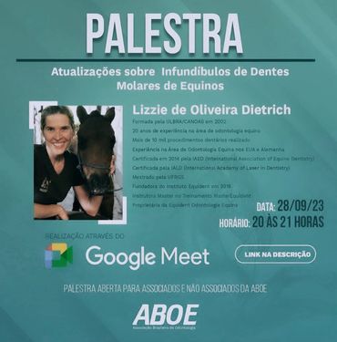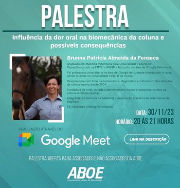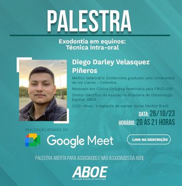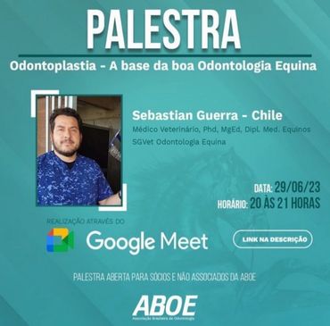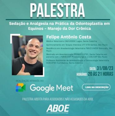 A ABOE - Associação Brasileira de Odontologia Equina, vem por meio deste, convocar toda a diretoria, sócios e futuros associados a participarem da Reunião via Google Meet, link enviado na data, dia 29/10/2025 às 20:00h em primeira chamada e 20:30h com todos os presentes.
